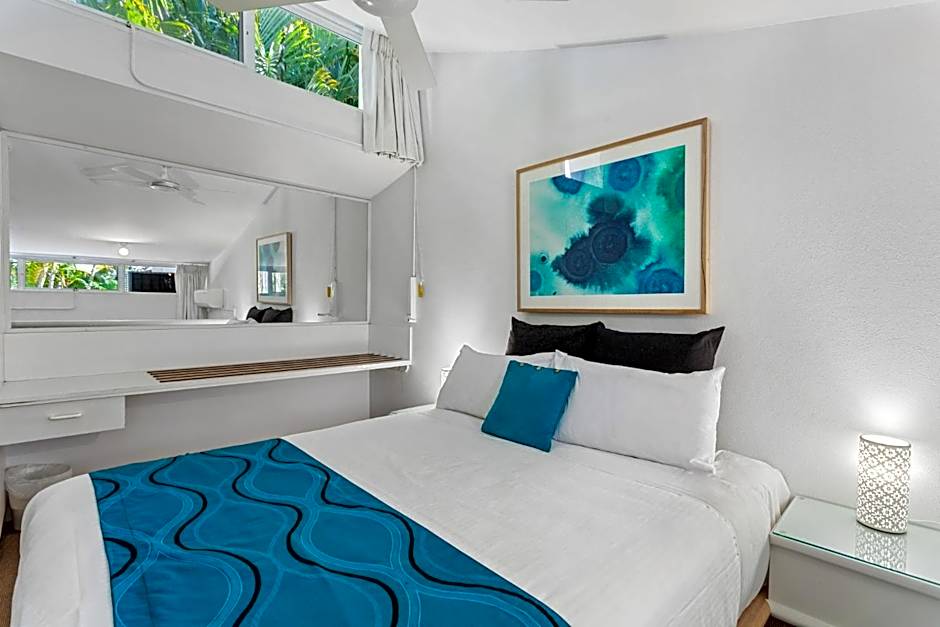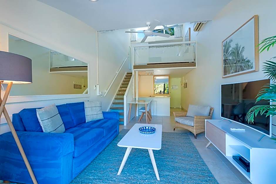 Fully self-contained apartments with a bedroom on the mezzanine level, heating, air conditioning, kitchenette, double sofa bed, cable TV, private courtyard and tropical garden outlook.